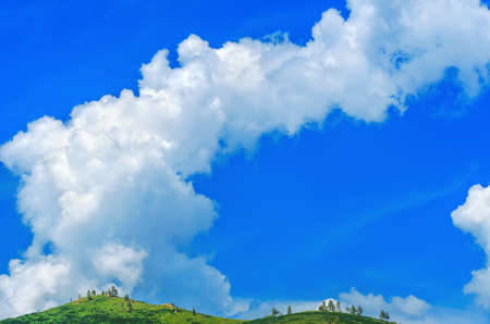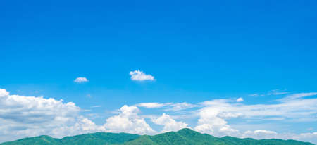 Blue sky and white cumulus clouds over green mountain. Beauty in nature. White fluffy clouds. Tropical nature. Sunny day. Heaven and tranquil scene. Summer weather. Love nature concept. Fresh air.