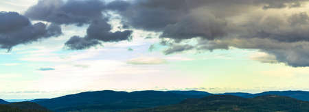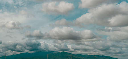 Panorama view of the overcast sky above the green mountain and electric pylons. Dramatic sky and cumulus clouds. Cloudy and moody sky. Storm sky. Cloudscape. Overcast clouds. Beauty in nature.