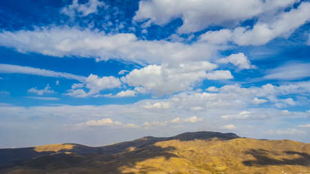 steppe hills in the middle of the summer against blue sky and white clouds