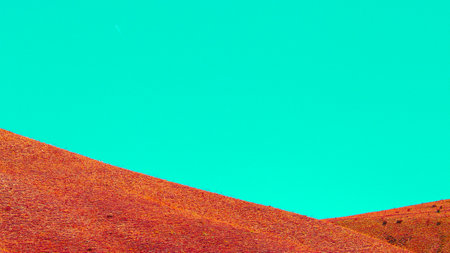 A striking abstract background featuring red hills and a cyan sky, blending natural beauty with surreal colors, Erzurum, Turkey.