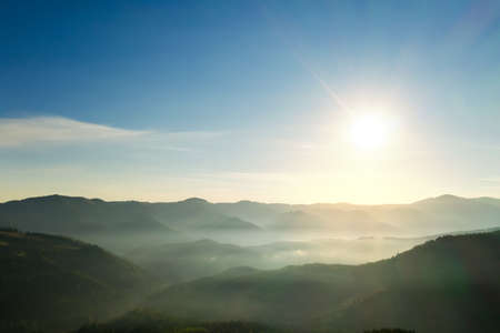Sun shining over forest in misty mountains. Drone photography