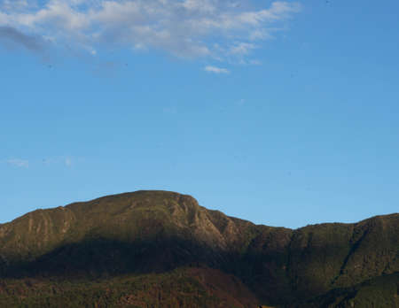 A clear blue sky behind a mountain illuminated by the light of sunset, near the colonial town of Villa de Leyva in central Colombia.