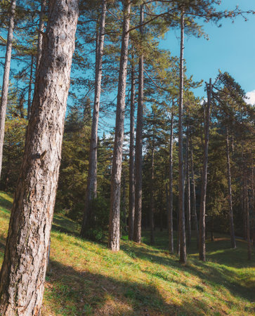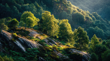 Explore an enchanting forest landscape adorned with diverse greenery and soft sunlight illuminating the majestic trees in a serene mountain setting.