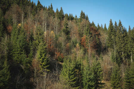 Autumn forest textures with colorful leaves and pine trees in the Slovakian mountains Europe