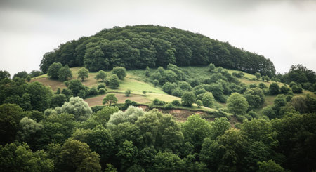 A scenic view of a densely forested hillside with rolling green terrain and scattered trees under a cloudy sky, evoking a sense of natural beauty and tranquility.