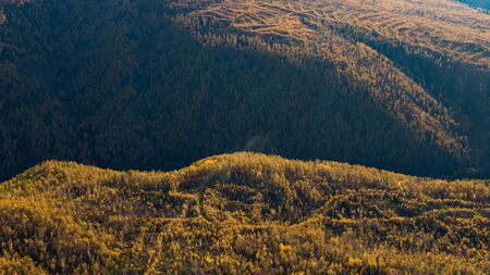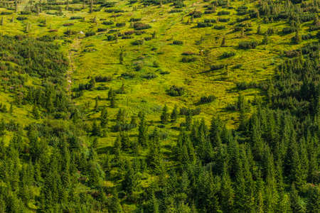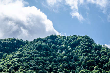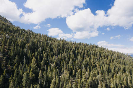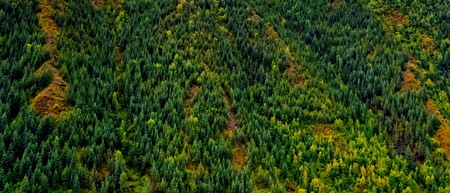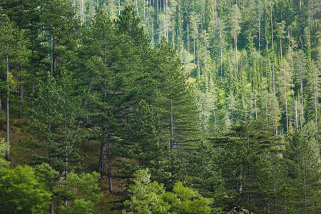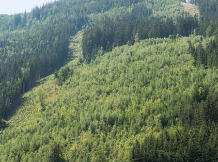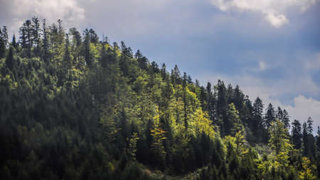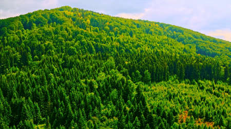 Background Mountain with coniferous forest, side view. Untouched coniferous forest. Green coniferous trees are growing. Mountain forest landscape, closeup photo. Copy space