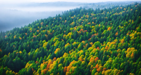 the mountain slopes, cloaked in a misty veil, showcase a striking contrast of deciduous trees, their autumnal hues muted by the rain, alongside towering firs, their evergreen canopies a vibrant splash against the grey sky, as the tops of the trees peek out from the foggy veil. ai generated