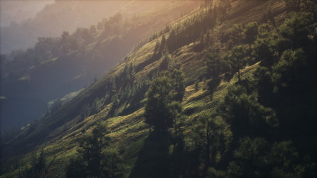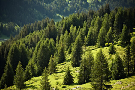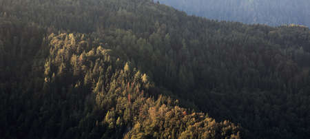 Sunlit green spruce forest slope viewed from distance. Atmosphere, magical nature, forestry, climate change and environment concepts.