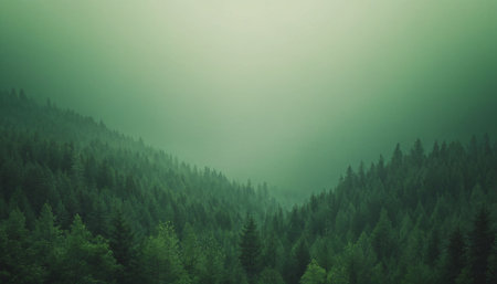 This atmospheric image depicts a misty forest with evergreen trees shrouded in fog, creating a tranquil and serene environment that showcases nature's untamed beauty.