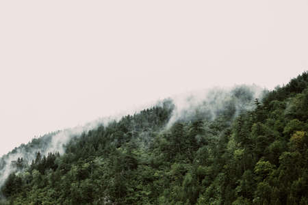 Moody and spooky cinematic forest in mountain during rain. Clouds and fog on mountain cover forest valley