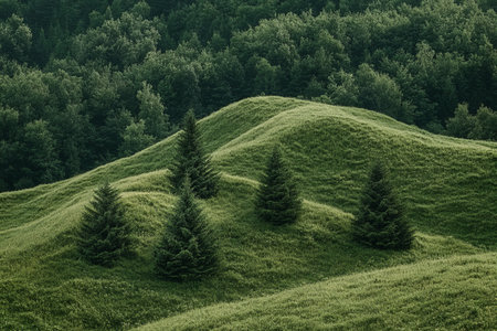 Scenic view of a lush green hill surrounded by pine forests in the carpathian mountains