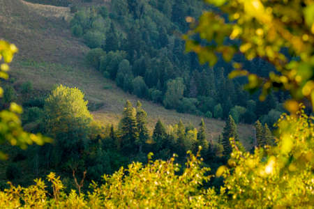 Beautiful landscape with coniferous forest at sunset in the mountains