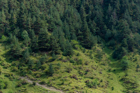 Closeup of a green Christmas tree forest, mountain landscape. Georgia
