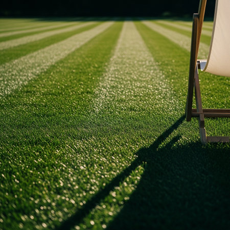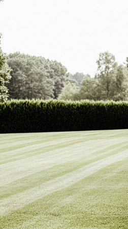 A beautifully maintained lawn showcases freshly cut striped grass. Vibrant green shrubs border the area creating a calm atmosphere on a sunny day perfect for outdoor activities.