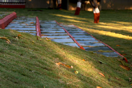 View of cement tiles steps in garden with green loan