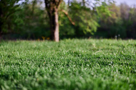 Green grass on the ground in the early morning. Landscape.