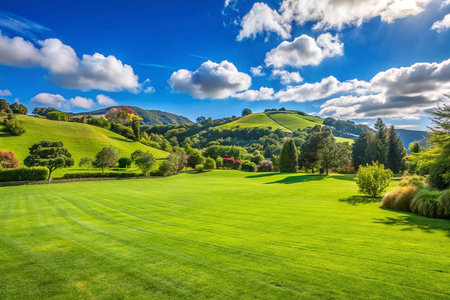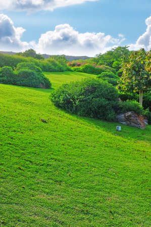Sunny hills, green lawn, estate garden, cloud sky, idyllic landscape