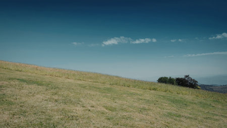 A picturesque landscape featuring a lush green hill under a clear blue sky with a few scattered clouds.