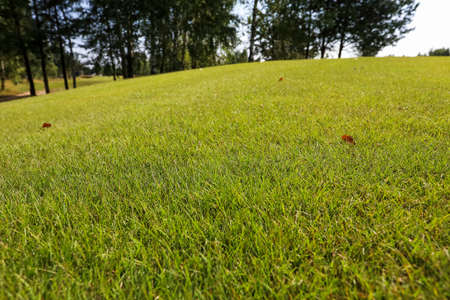mowed green grass on which people walk, summer season