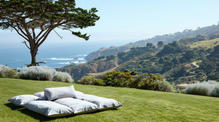 a bed with linen sheets positioned at the seaside of California, evoking a sense of relaxation and coastal serenity