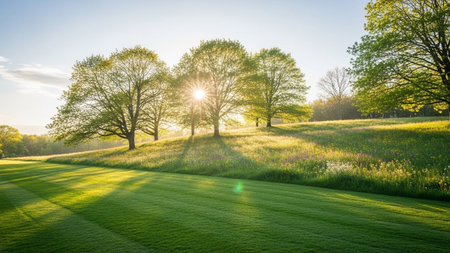 Hillside showing sunlight streaming through green trees on a rolling hillside with mown lawn and wildflowers at...