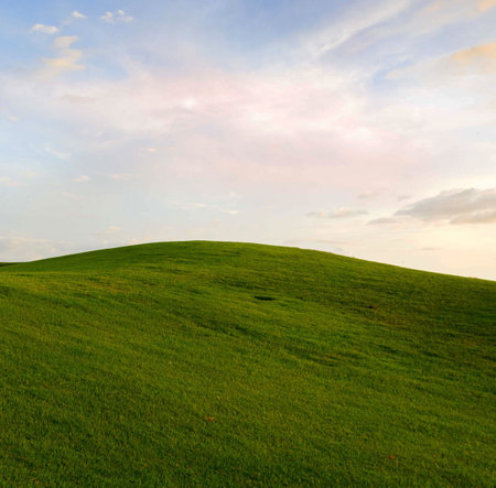 A serene landscape featuring a sunset over gently rolling hills with lush green grass and a clear blue sky.