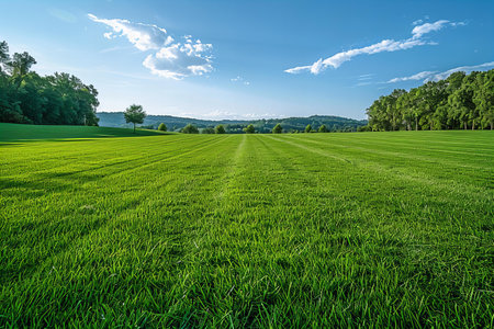 A lush green grass field stretches beneath a clear blue sky, presenting a serene and tranquil landscape perfect for nature-themed photography and artistic projects.