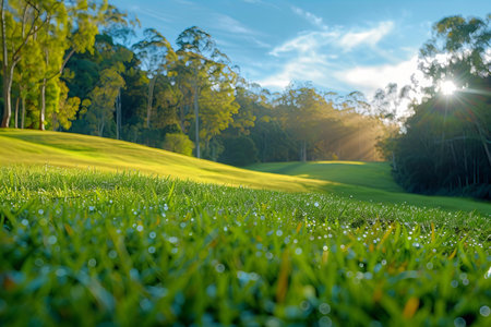 Captivating close-up of vibrant grass on a golf course, showcasing the beauty of nature under soft sunlight, ideal for projects focusing on outdoor activities and landscapes.