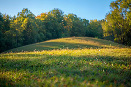 Digital image of beautiful grassy hill, bathed in the golden light of late afternoon sun, is blurred with shallow depth of field. the background features trees and blue sky.