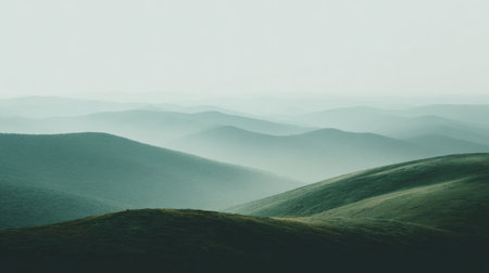 Explore a breathtaking view of misty valleys and rolling hills in a serene mountain landscape under a clear sky, capturing the essence of the wilderness.