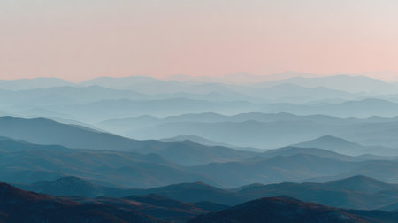 Experience the peaceful beauty of misty blue mountains at dawn under a soft pink sky. This serene landscape captures the tranquility and depth of nature's artistry.