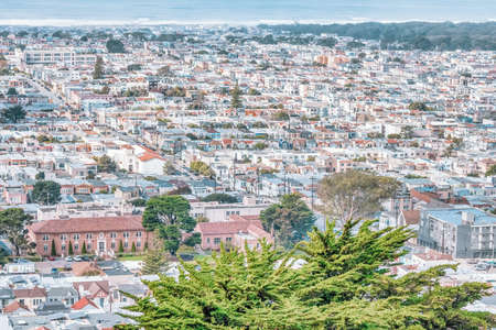 San Francisco, California, USA - October 22, 2021, city view from the top, of San Francisco's Grandview Park next to the 16th Avenue tiled steps. The photo was processed in pastel colors.
