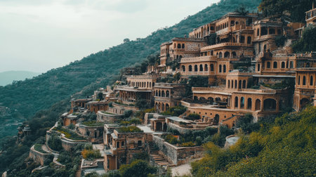 View of Neemrana Fort-Palace from a hillside, showcasing its layered terraces and scenic hilltop location, perfect for a luxury weekend