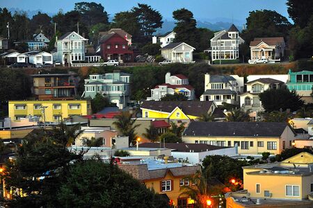 San Francisco, California, USA - October 16, 2021, descending row of stately homes on a hill, a typical neighborhood in San Francisco. Photo processed, in pastel colors