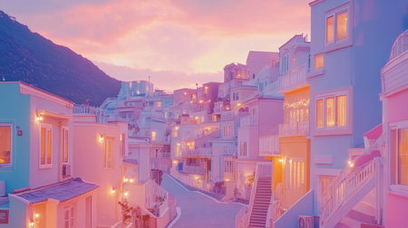 Discover a beautiful scene of pastel-colored houses illuminated by a warm sunset glow, creating a serene and inviting atmosphere perfect for exploration and inspiration.