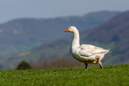 White domestic goose walk on green meadow with mountains in the background.