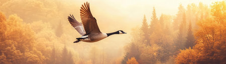 A majestic goose spreads its wings over a misty lake at dawn, capturing the serene beauty of wildlife in a tranquil setting with vibrant autumn colors.