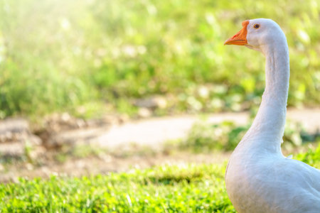 Portrait of Domestic goose, Anser cygnoides domesticus, in profile on bright green blured background. Domesticated grey goose, greylag goose or white goose portrait