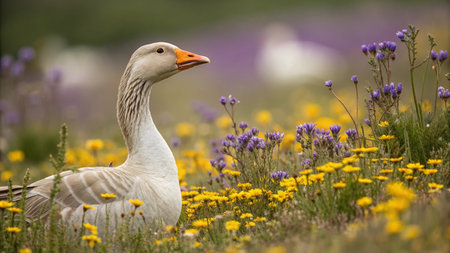 A solitary goose stands gracefully in a vibrant field of wildflowers under a warm sunset, capturing the essence of tranquility and natural beauty.