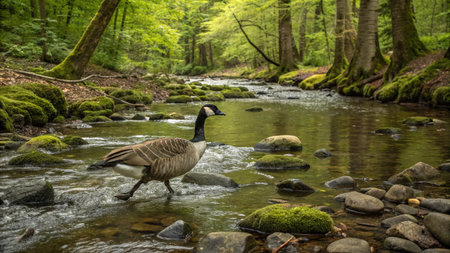 Goose in a stream in the forest with green moss and stones