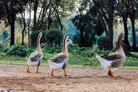 Geese with distinctive plumage in an urban park setting, depicting natures interaction within a city environment. Vibrant greenery accents the scene.