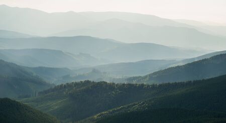 Beautiful landscape of a green forest and mountains almost at sunset in the summer
