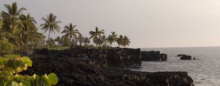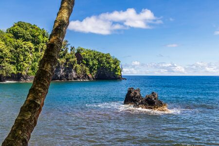 Bay north of Hilo, on Hawaii's Big Island. Palm tree in foreground; rock visible above blue sea. Green coastline, blue sky and clouds visible in the distance.