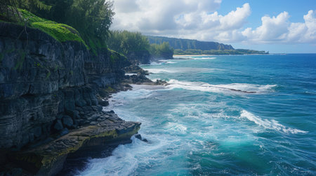 A picturesque coastal cliff with waves crashing against the rocks below