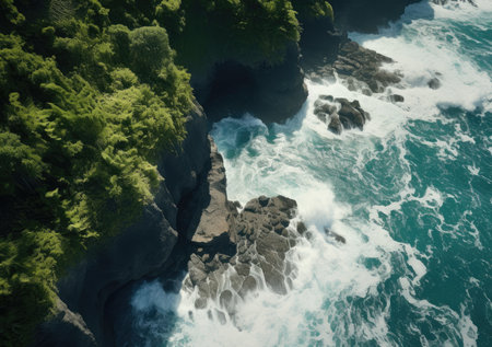 Aerial view of a picturesque coastline with waves crashing against the shore, emphasizing the beauty of flying