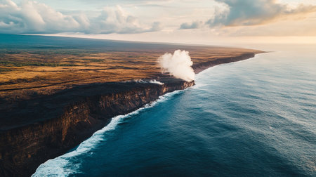 Captivating aerial shot of a coastline featuring a fiery cliffside with smoke billowing into the sky above crashing ocean waves and lush greenery.