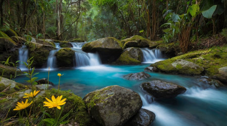 An AI generated illustration of a tranquil stream running through dense tropical jungle
