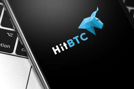closeup HitBTC cryptocurrency exchange logo on the screen smartphone. Moscow, Russia - March 26, 2019