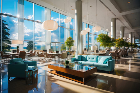 Luxury hotel lobby interior with modern furniture and large windows.