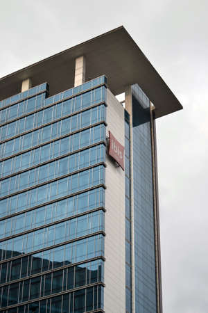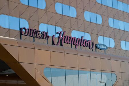 Saint Petersburg, Russia - April 06, 2019: Hampton by Hilton hotel logo on the office building